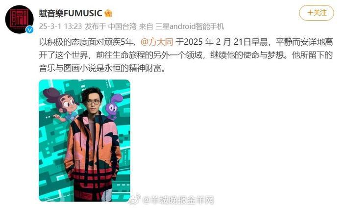 以积极的态度面对顽疾5年,方大同于2025年2月21日早晨,平静而安详地离开了这个世界,前往生命旅程的另外一个领域,继续他的使命与梦想。他所留下的音乐与图画小说是永恒的精神财富。